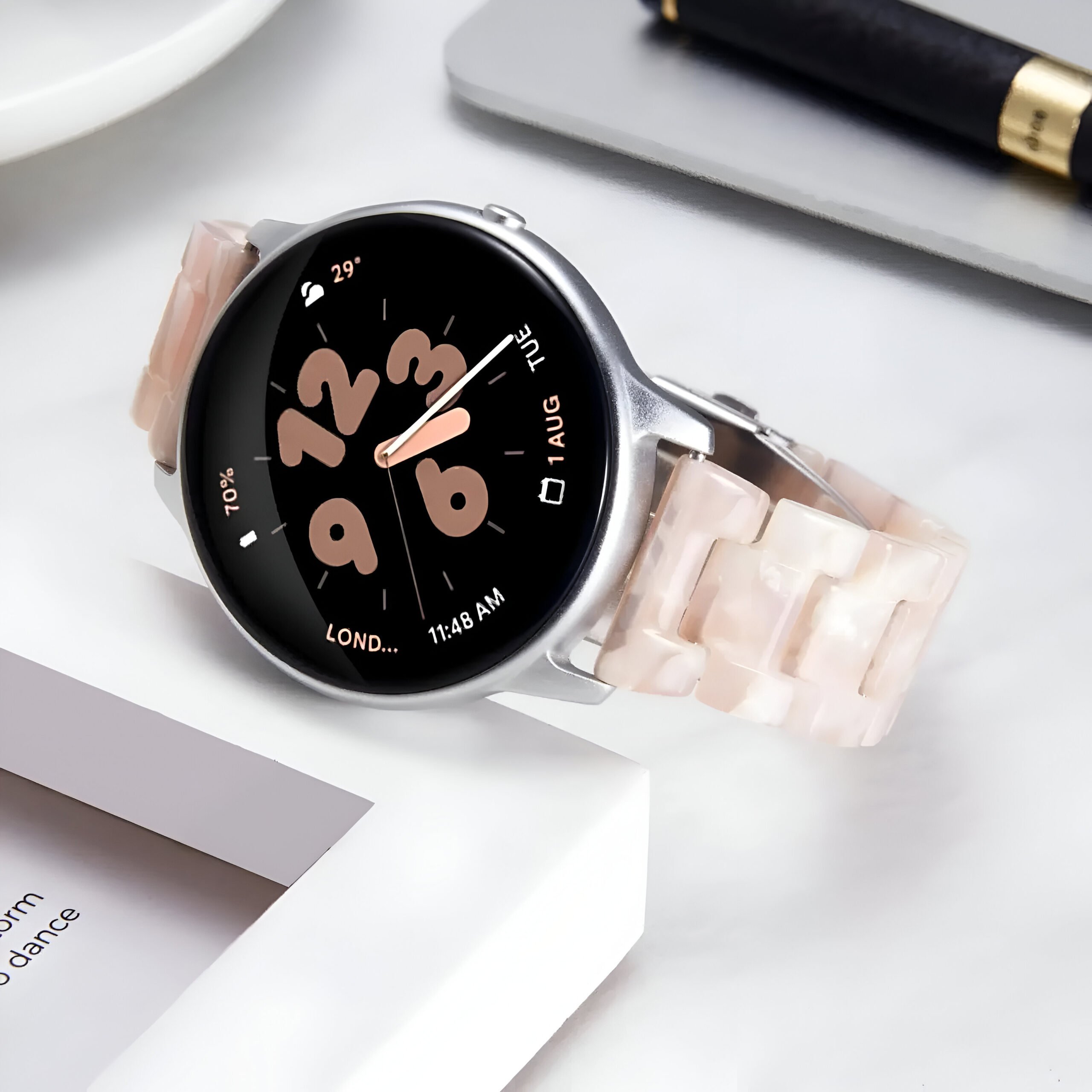 This resin strap stands out with its blend of elegance and practicality. Its polished finish mimics the sophistication of a metal band while being significantly lighter. Ideal for everyday wear or special occasions, it’s built to handle all your activities. Plus, the eco-friendly resin material means you can look good while making a better choice for the planet.