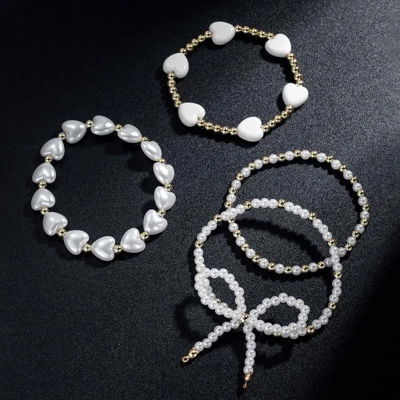 4-Piece Vintage Gold Heart & Pearl Bowknot Bracelet Set
