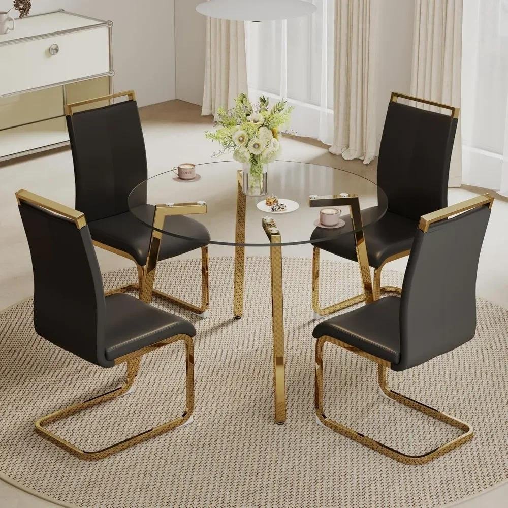 Upgrade your dining experience with this stunning 42” round glass dining table set, designed to bring a touch of sophistication and comfort to your home. Perfect for small dining spaces, apartments, kitchens, or cozy restaurant settings, this 5-piece set features a sleek round tempered glass table and four ergonomically designed armless chairs wrapped in black PU leather. The clean lines, golden metal legs, and modern finish make it a statement piece that blends beautifully with both contemporary and transitional interiors.