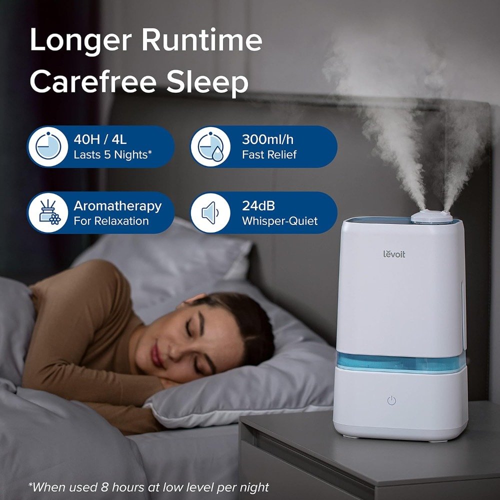 • Large 4L Capacity: Holds up to 1.05 gallons of water, providing up to 40 hours of continuous mist on the lowest setting.