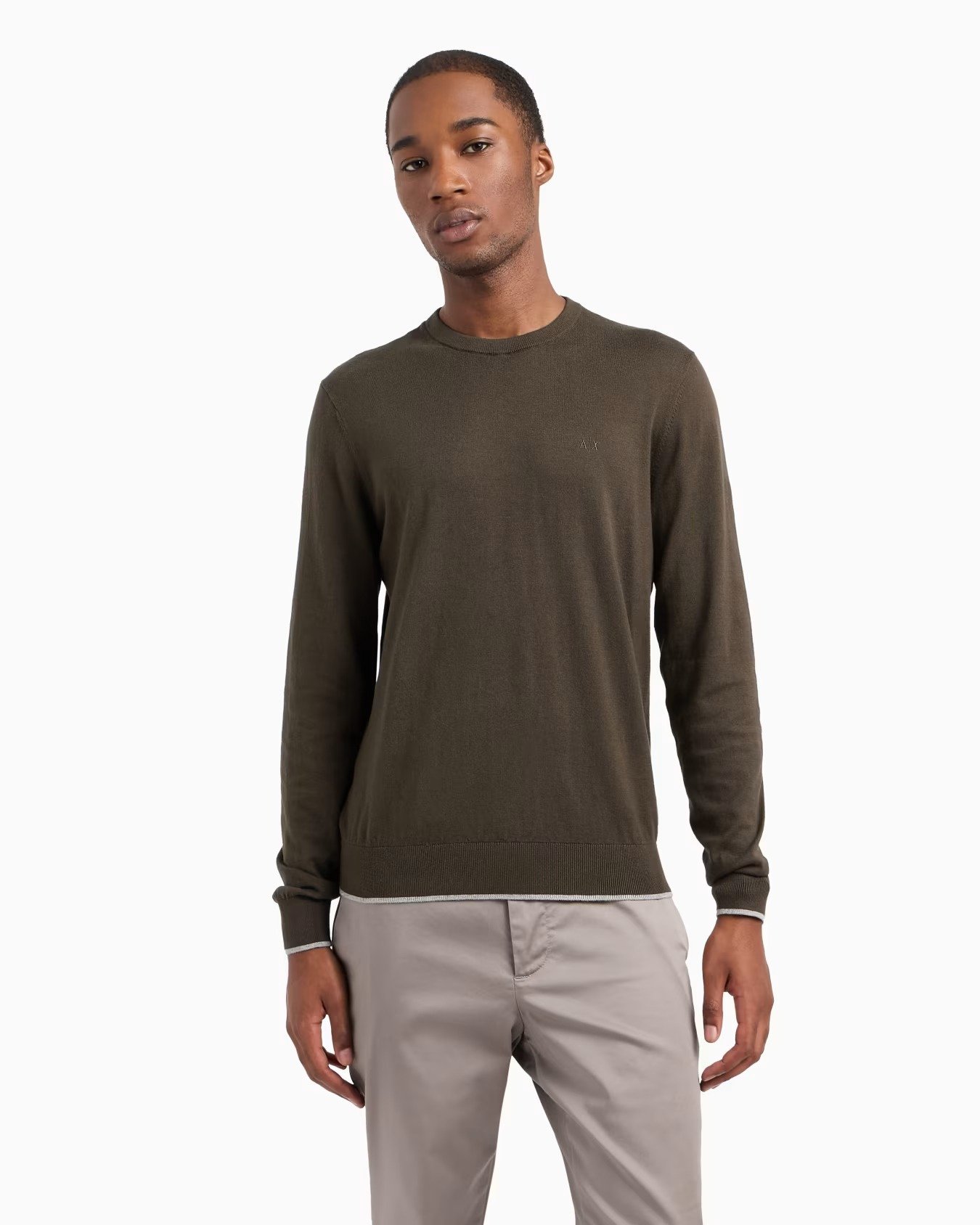 The Armani Exchange Men’s Knitwear stands out with its premium material composition. The addition of cashmere to high-quality cotton provides unmatched softness and warmth without compromising durability. Its plain design and rich green tone make it an evergreen piece that never goes out of style, ensuring you look effortlessly polished wherever you go.