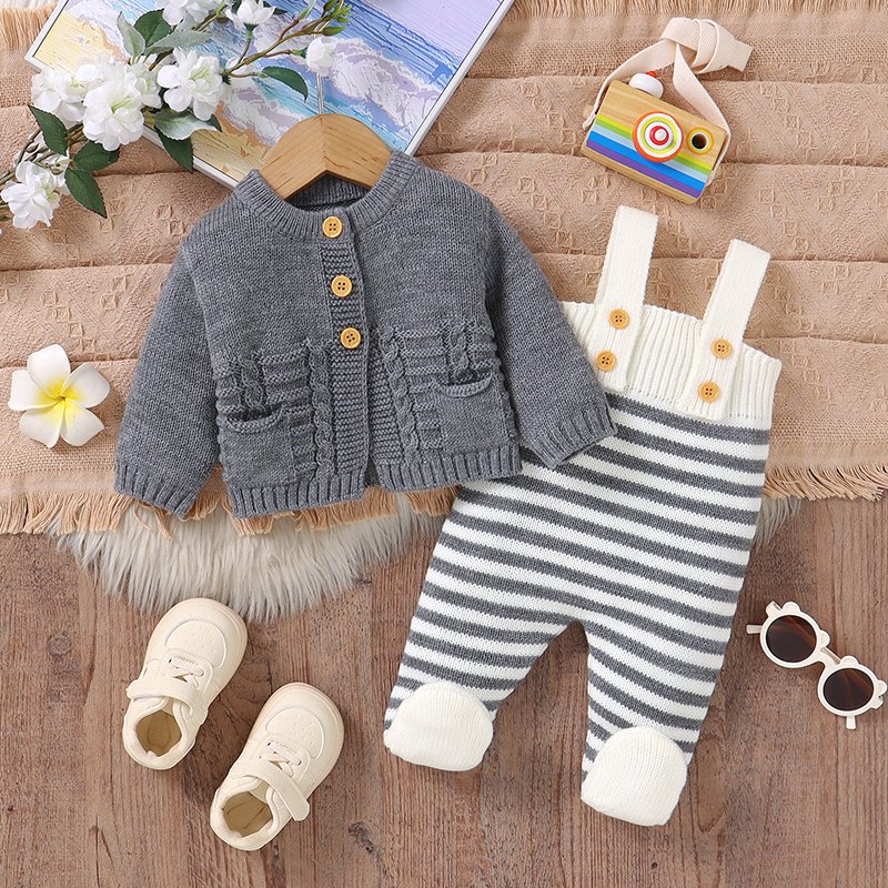 Baby Knitted Sweater & Jumpsuit Set for Toddlers – Striped Cardigan + Romper