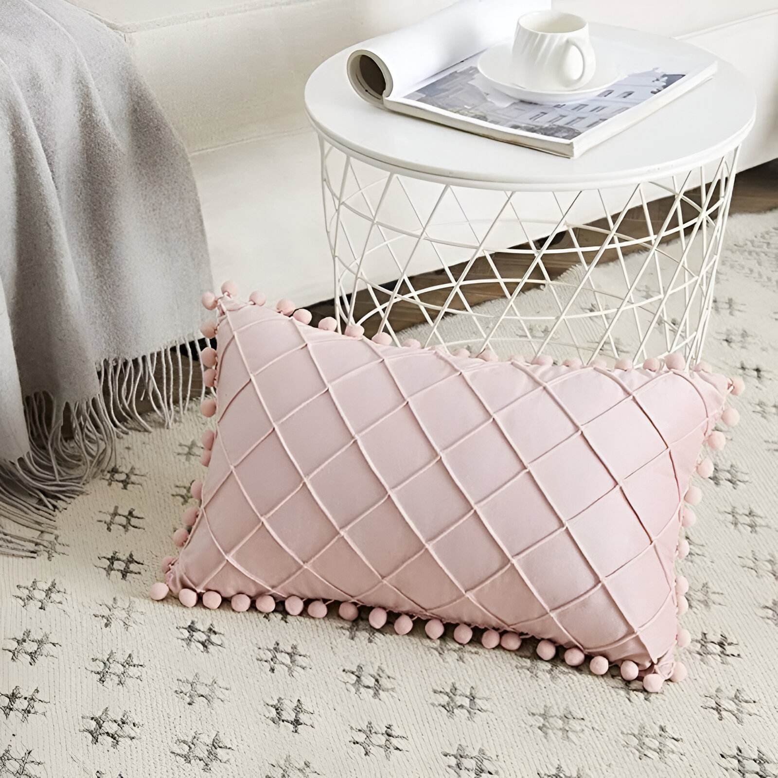 • Boho-Inspired Design: The soothing pink plaid pattern, accented with playful pom-poms, brings a touch of rustic charm to any space. It’s a versatile piece that blends effortlessly with both modern and traditional interiors.