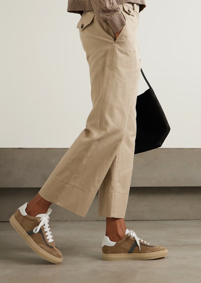 Step into elegance with these Leather Sneakers by Brunello Cucinelli. Crafted from a luxurious blend of suede and leather, these sneakers elevate a classic design with unique and stylish details. Featuring a lace-up front fastening for a secure fit, a round toe for added comfort, and a flat sole for easy wear, these sneakers are a versatile addition to your wardrobe. The standout feature? The iconic shiny bead applique detail that adds a touch of glamour and personality to these otherwise understated sneakers. Whether you’re running errands, meeting friends, or looking for a refined casual look, these sneakers deliver on both comfort and style.