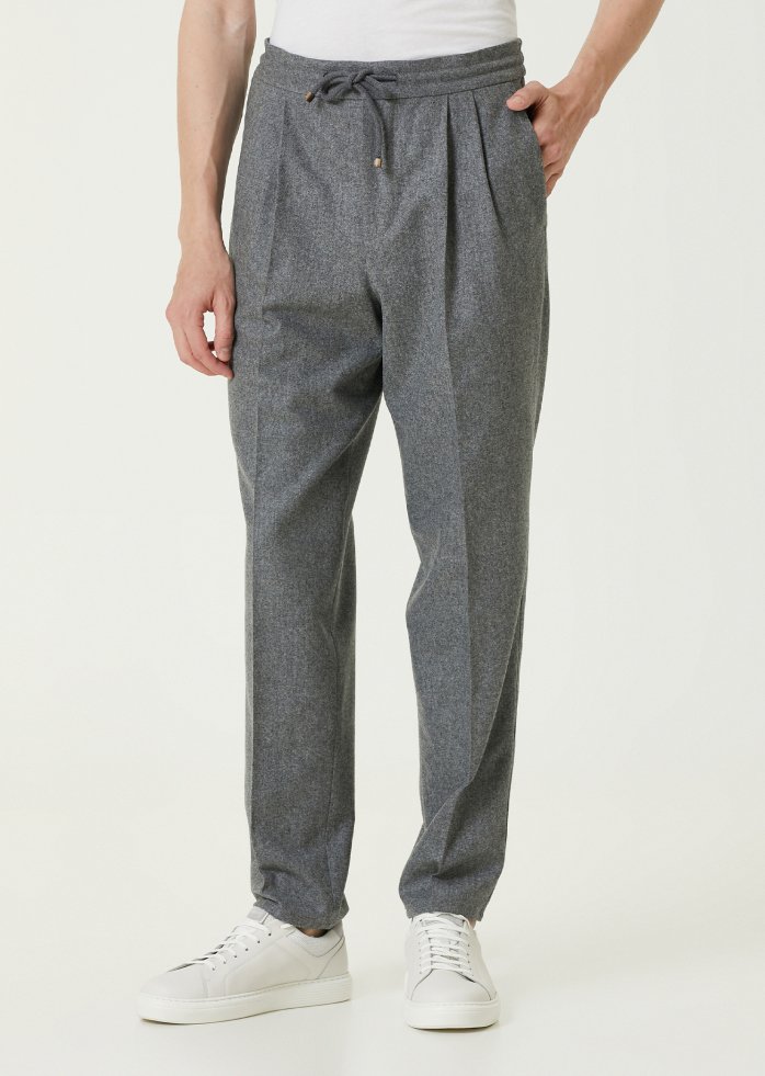 Experience the perfect blend of comfort and sophistication with these Virgin Wool Pants by Brunello Cucinelli. Crafted from premium virgin wool, these pants offer a soft, luxurious feel against the skin, while the mélange pattern adds a touch of modern style. The adjustable drawstring waistband provides a customized fit, ensuring all-day comfort and ease of movement. Designed with practicality in mind, these pants feature a front button and zipper closure, along with two side slash pockets and two welt pockets at the back for a sleek, functional look.