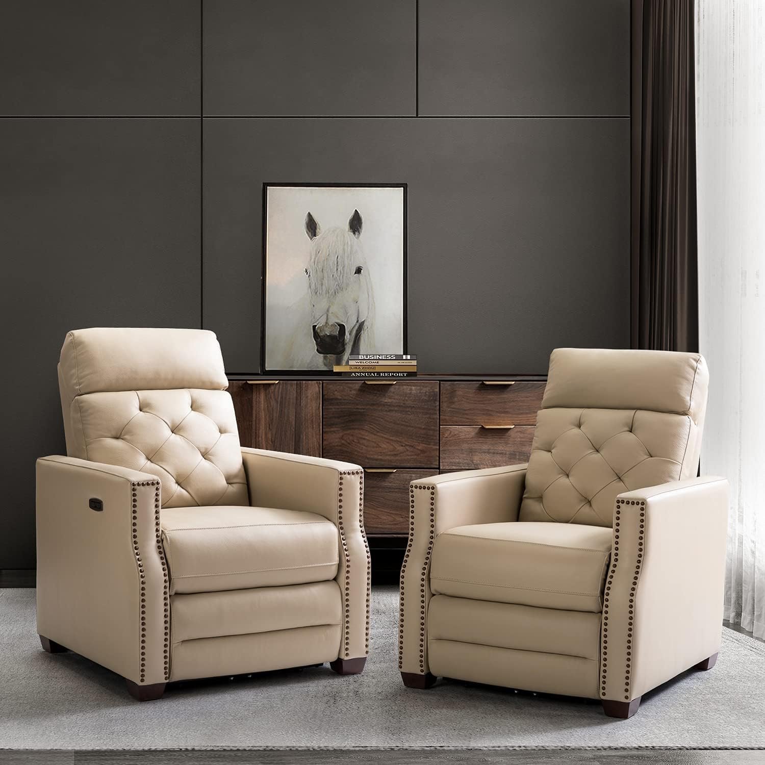 Crafted in a contemporary classic style, this recliner boasts a genuine leather surface that’s soft, durable, and easy to clean. The tufted backrest and beautiful nailhead trim add a sophisticated flair, making it a standout piece in your living room, home theater, or office. The beige color offers a neutral tone that complements a variety of décor styles, from minimalist modern to traditional luxury.