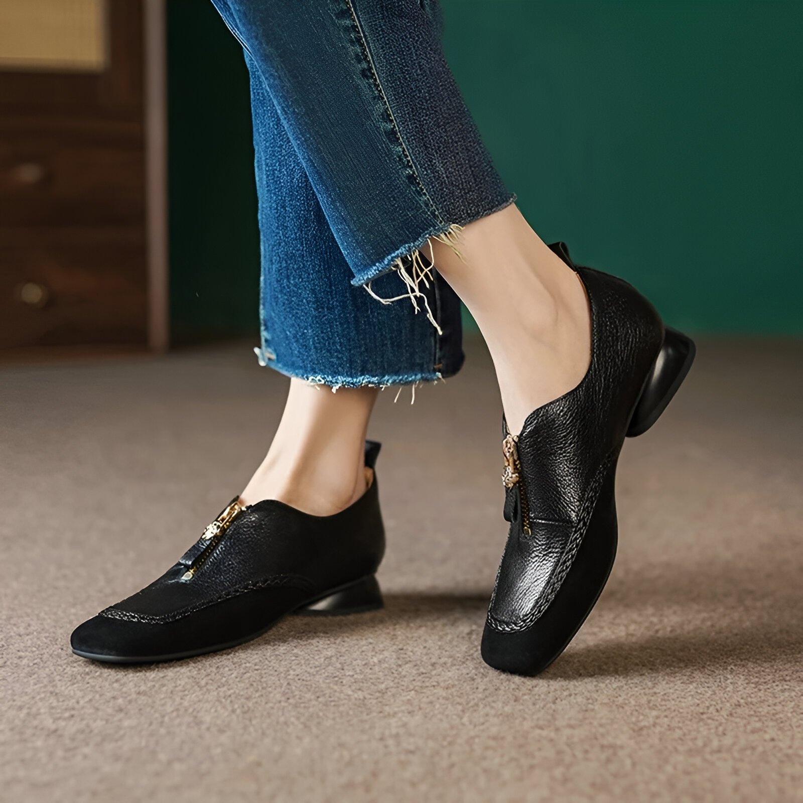 These pumps feature a clean, classic silhouette with a contemporary twist: the square toe adds a modern flair, while the sleek side zipper enhances both style and ease of wear. Handmade with care and attention to detail, this pair embodies minimalist charm and high-quality craftsmanship.
