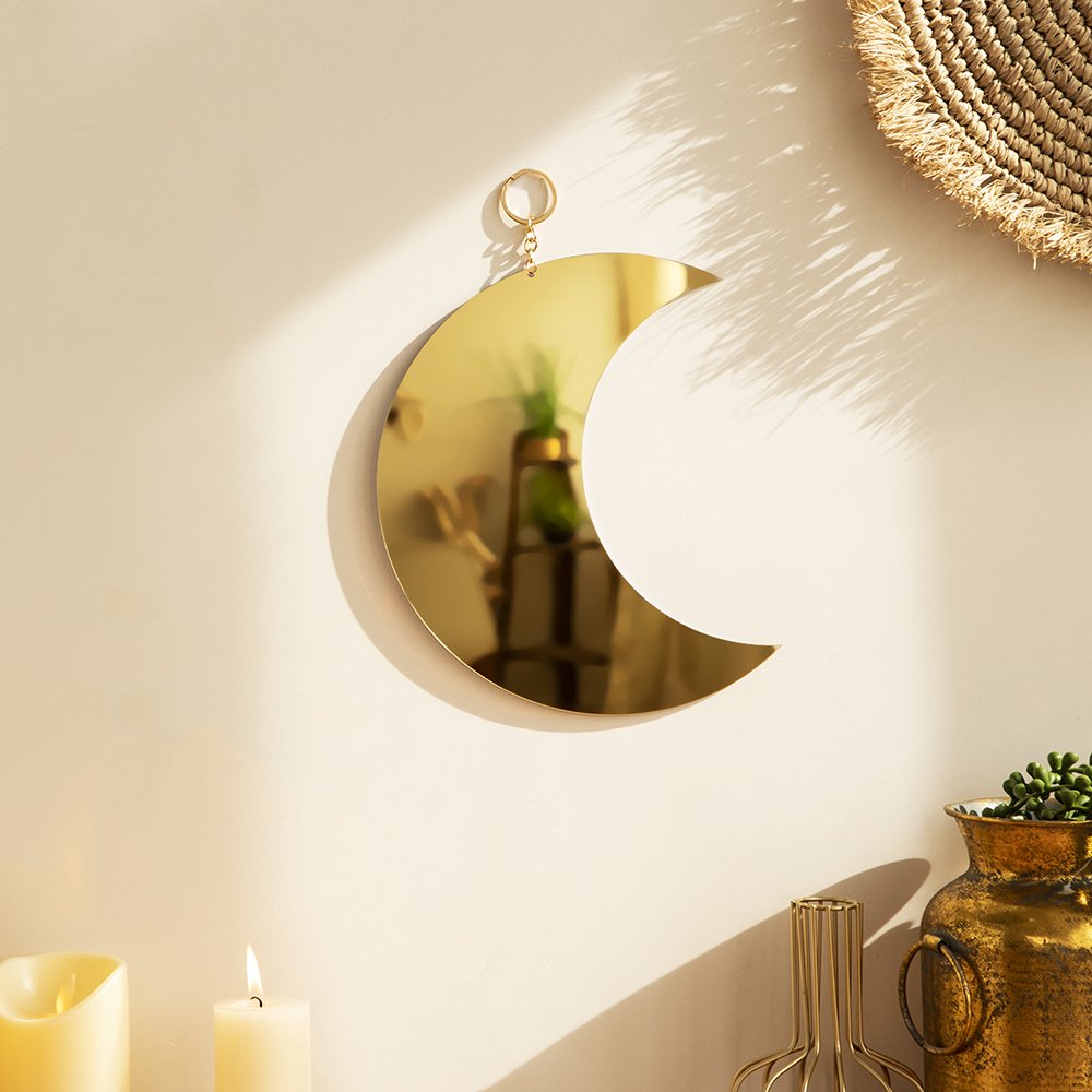 This decorative mirror is perfect for daily use and occasional styling. Add it to your morning makeup routine in your vanity area, or let it reflect soft lighting in a cozy bedroom corner. It’s also a whimsical addition to a nursery or creative touch to an apartment wall. No matter where you place it, this moon mirror effortlessly enhances your space with its golden glow and artistic charm.