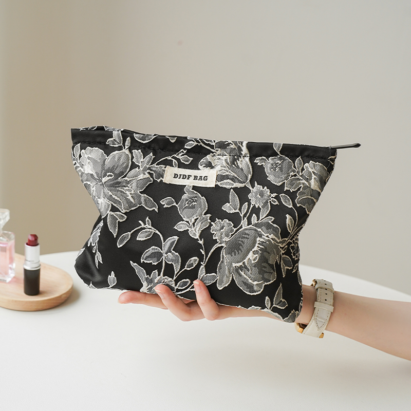 Keep your beauty essentials organized in style with this large capacity black floral cosmetic bag. Designed with a chic floral pattern and a sleek black finish, this bag is not only practical but also a fashionable accessory to carry with you. Whether at home or on the go, it ensures your makeup and toiletries are always within reach and neatly stored.