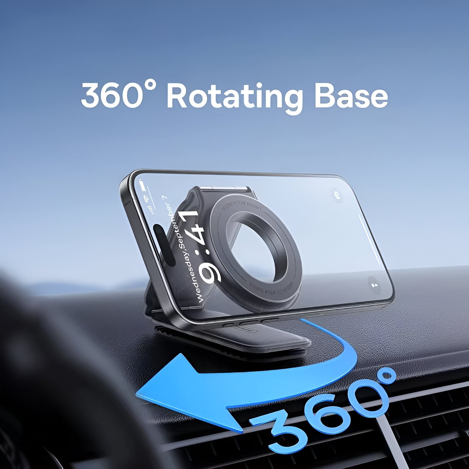 This phone holder is built for ease and functionality. The foldable design with a strong magnetic attachment allows you to mount your phone horizontally or vertically with just one hand. The 360° rotating base makes it easy to position your phone at the perfect angle for navigation, calls, or music – without ever blocking your view. And thanks to the high-damping design, your device stays steady, even on bumpy roads.