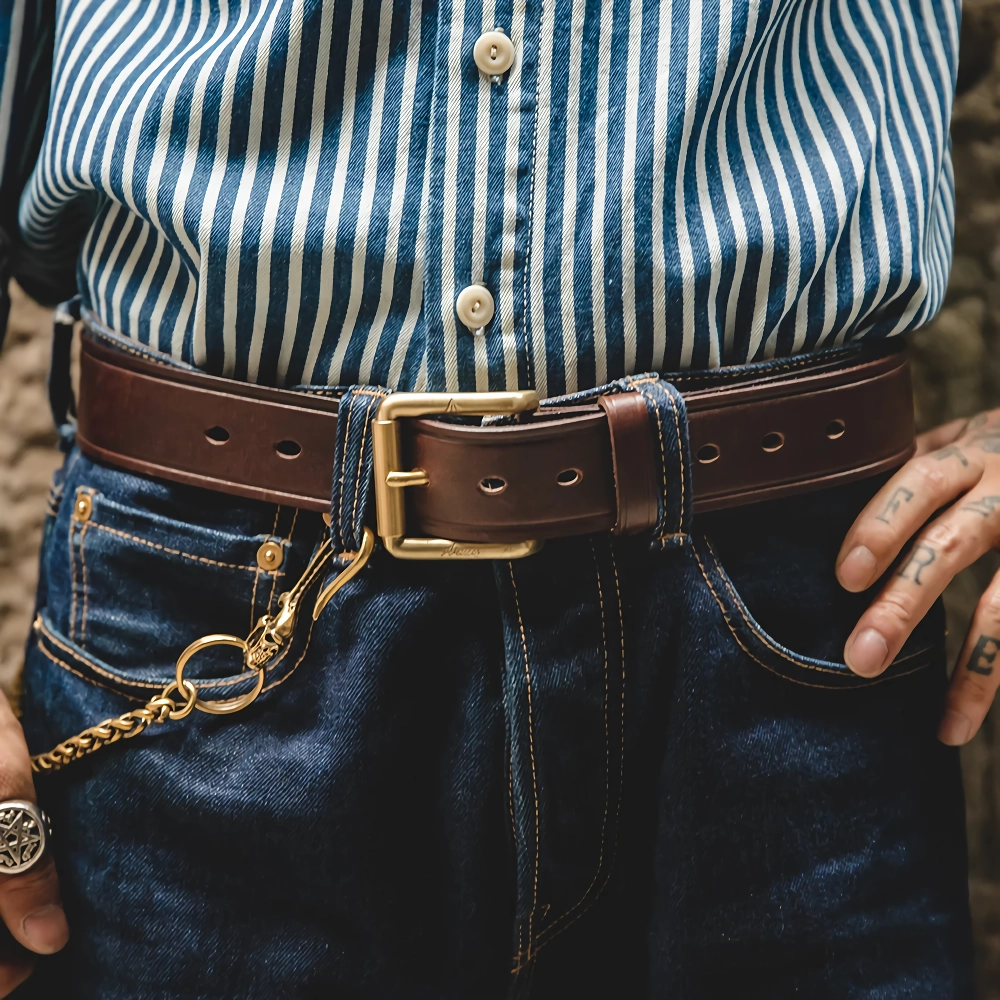 Men’s Vintage Cowhide Leather Belt with Brass Buckle – Casual Rugged Style