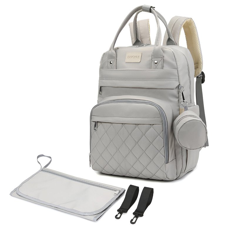 This versatile diaper backpack combines convenience and practicality in one sleek design. It comes with all the essential accessories for busy parents, including a free baby changing pad, two stroller hooks for easy attachment, and a small pacifier bag to keep your baby’s pacifier clean and within reach. The backpack’s spacious compartments are perfect for organizing diapers, wipes, bottles, and other baby essentials, while its sturdy fabric ensures durability through daily use.