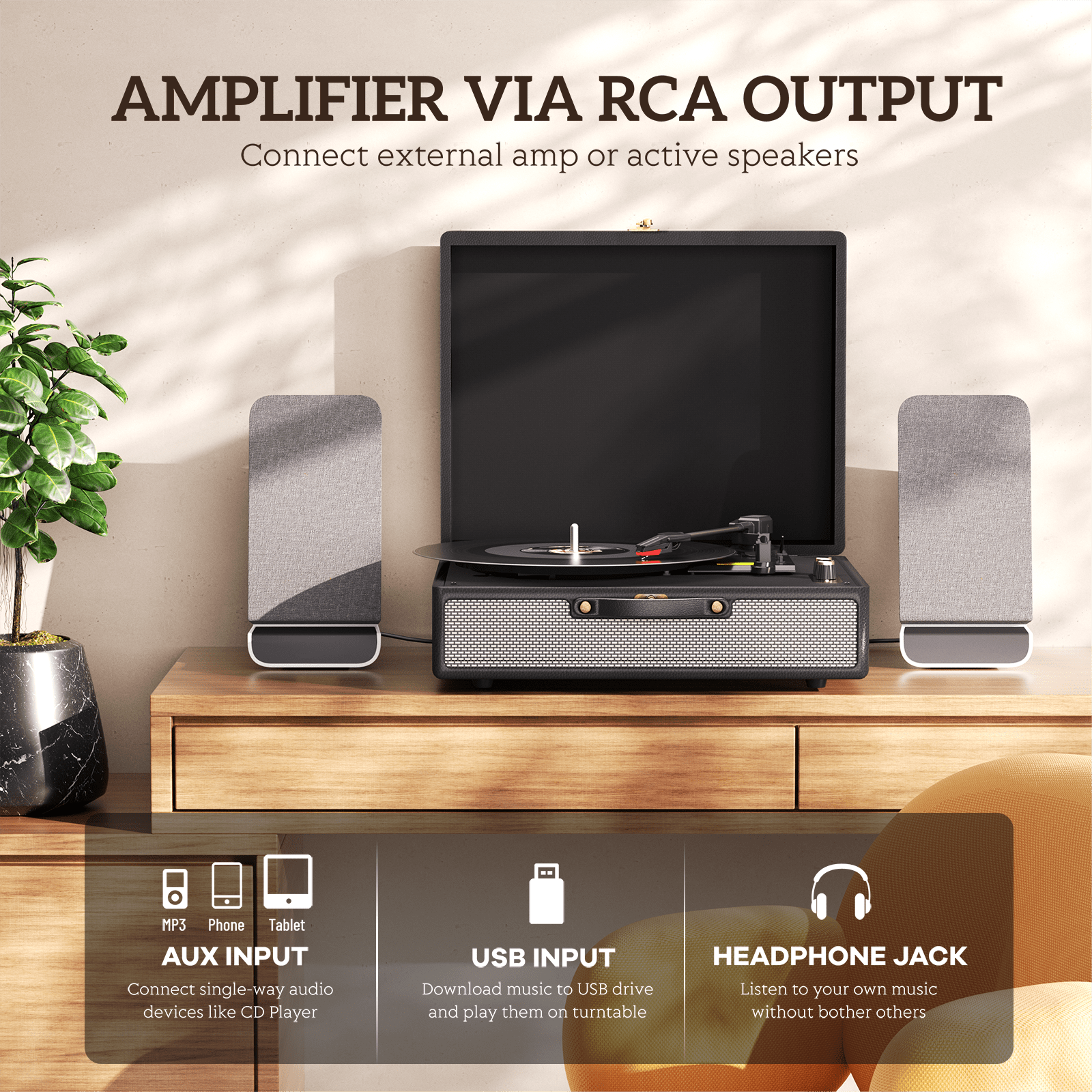 - Multiple Audio Inputs: In addition to Bluetooth, connect via AUX or RCA for versatile listening options. The built-in stereo speakers offer high-quality sound, and you can easily amplify the music with external speakers if needed.