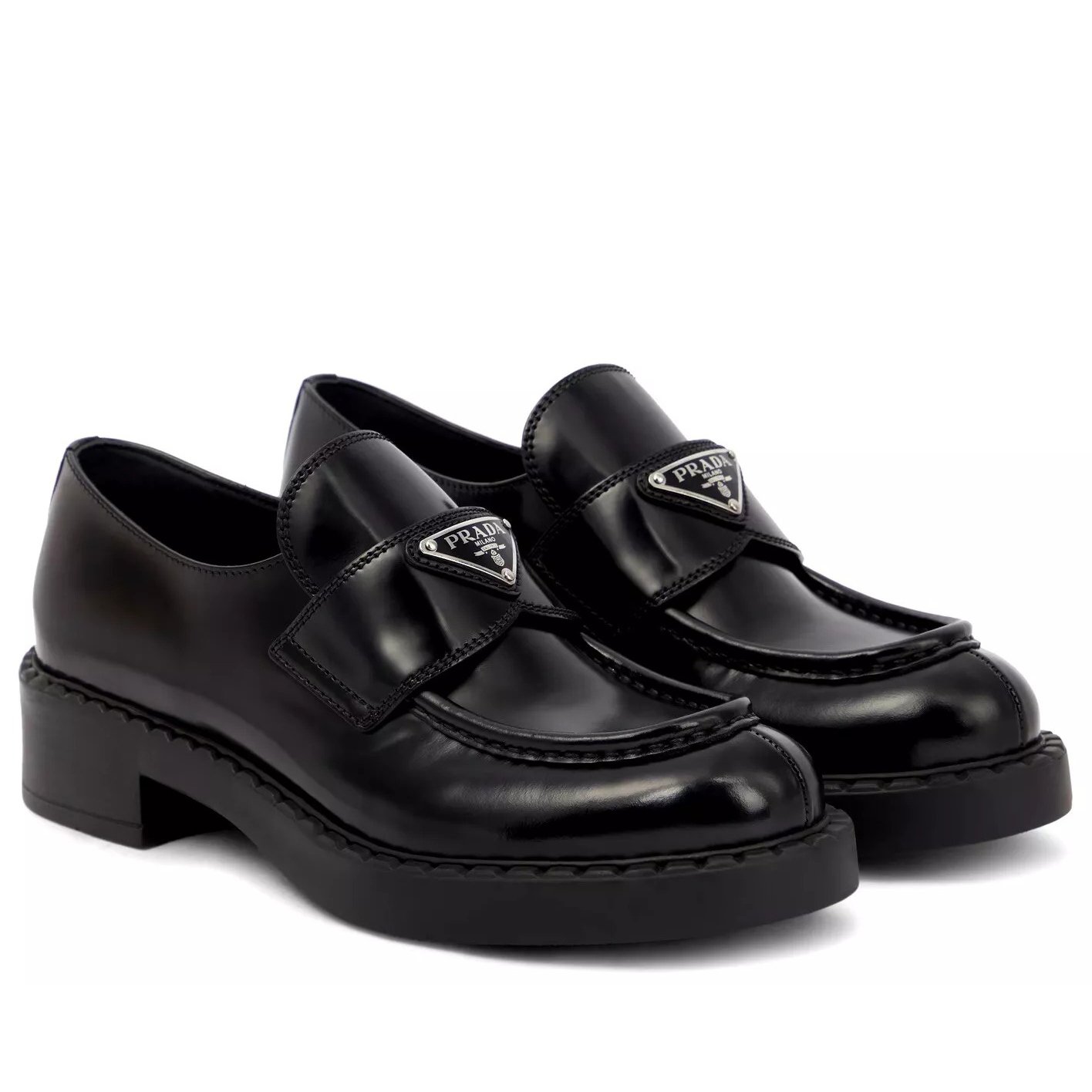 What makes these loafers so special is their ability to effortlessly transition from day to night. The sturdy block heel offers just the right lift without compromising comfort, while the polished finish adds a hint of glamour. The glazed triangular plaque is the perfect finishing touch, showcasing the quality and craftsmanship of the Prada brand.