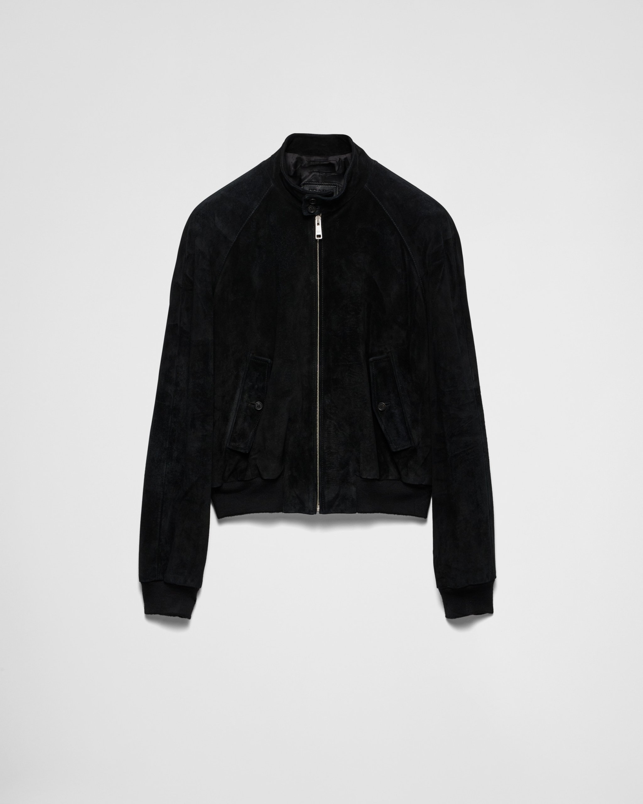 Prada Suede Bomber Jacket with High Collar and Ribbed Details