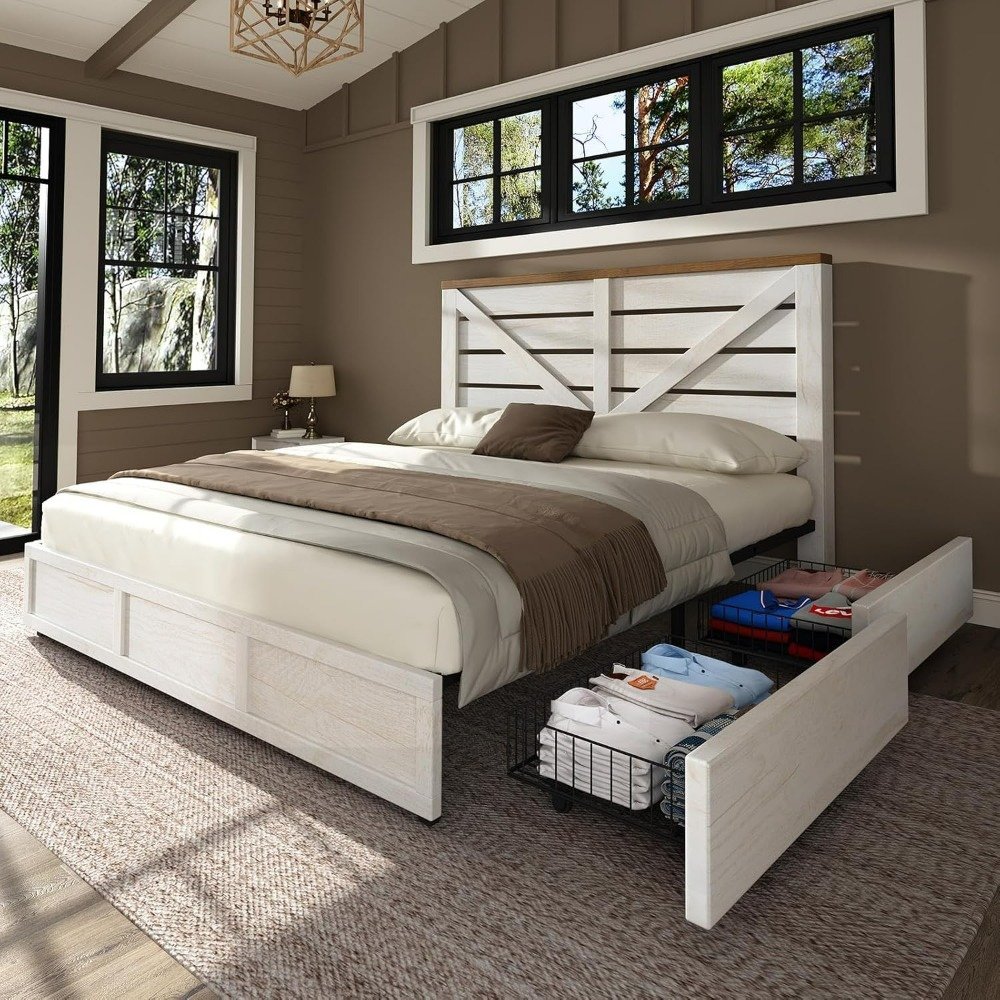 Bring timeless farmhouse style and smart functionality to your bedroom with this Queen Size Farmhouse Bed Frame. Designed to impress and built to last, this bed frame features a warm white and barnwood finish that creates a cozy, rustic atmosphere in any space. The barn-style headboard with arrow detailing adds a touch of vintage flair, while the sturdy construction ensures lasting support and stability. Whether you’re upgrading your master bedroom or furnishing a guest room, this bed is a stylish and space-saving solution.
