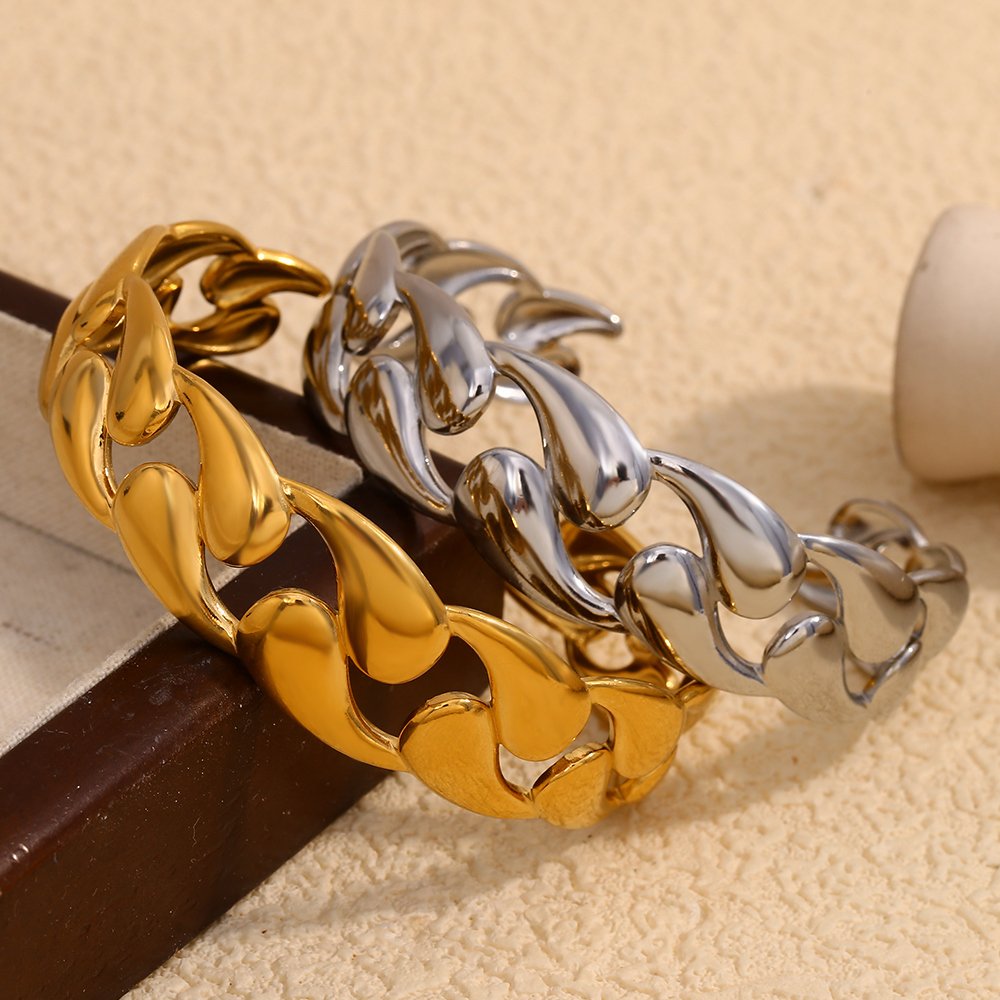 Introducing the Wide Face Hollow Water Droplet Bracelet, a stunning piece designed for the modern woman who loves to make a statement. Crafted from high-quality 316L stainless steel, this cuff bracelet features a unique water droplet-inspired design that is both bold and sophisticated. Its hollow pattern adds a touch of contemporary flair, making it the perfect accessory to complement any outfit. Whether you’re dressing up for a night out or adding a bit of edge to your daily look, this bracelet is the ideal choice.