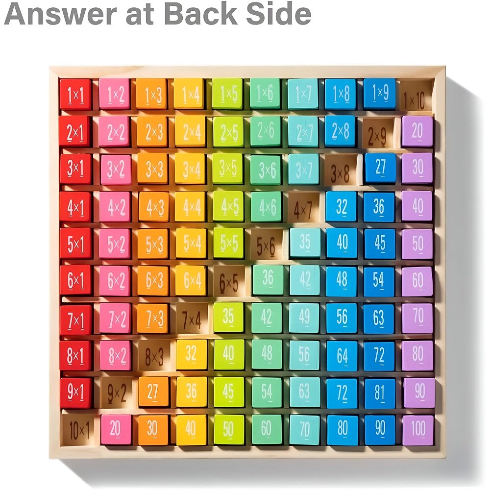 • Double-Sided Learning: Each of the 100 wooden blocks features a multiplication problem on one side and the solution on the reverse, promoting independent problem-solving.